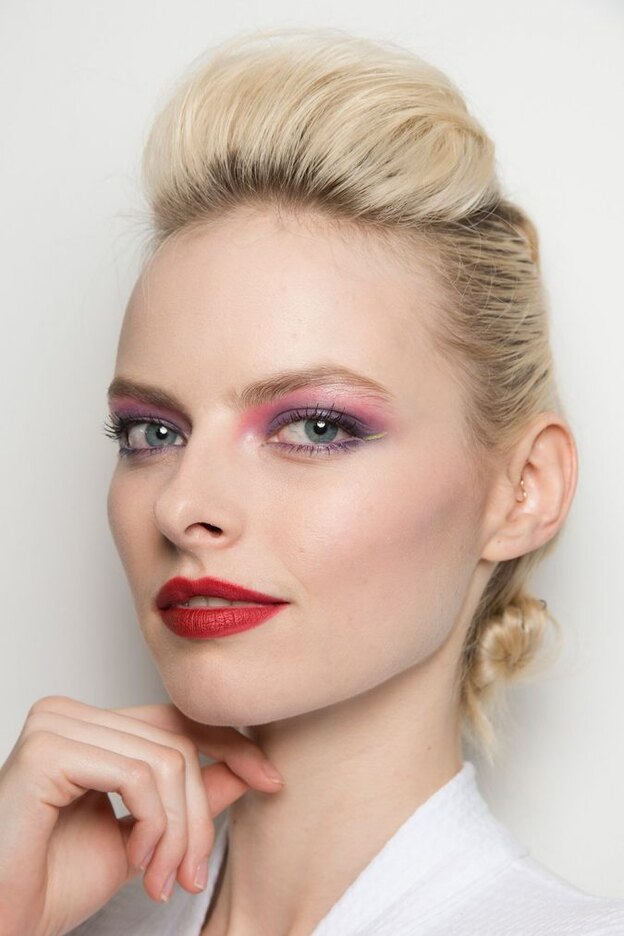 لبهای قرمز با آرایش چشم صورتی و بنفش