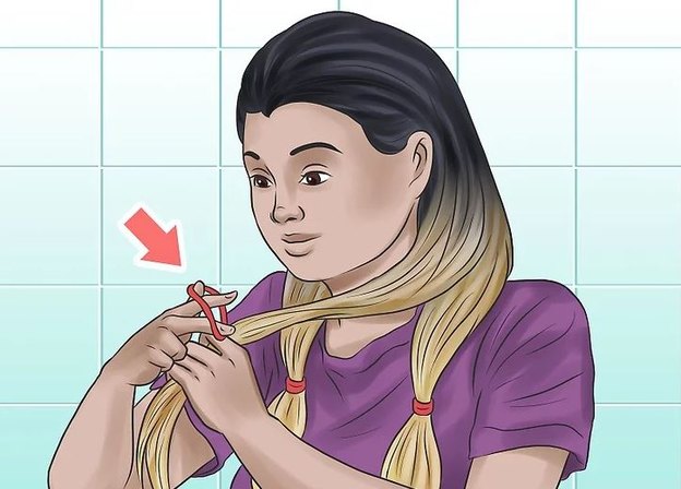 یک بار دیگر موهایتان را تقسیم کنید. موهایتان را به دو قسمت اصلی خودش تقسیم کنید. نوک آنها را با کش های پلاستیکی یا گیره ببندید تا کار رنگ آمیزی موهایتان کمی آسانتر شود. حداقل به 2-3 قسمت یا هر تعداد که احساس می کنید راحترید تقسیم کنید.