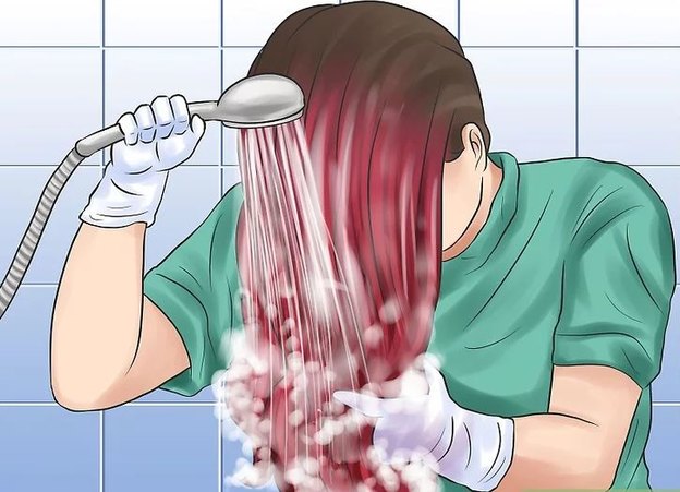رنگ را از روی موهایتان بشویید. دستکش ها را در دستتان نگه دارید و رنگ را با آب گرم و بعد با شامپوی بدون سولفات بشویید. دکلره یا رنگ کردن مو ممکن است به موها آسیب بزند. کمی وقت بگذارید و از نرم کننده قوی استفاده کنید تا رطوبت را به موهایتان بازگرداند.