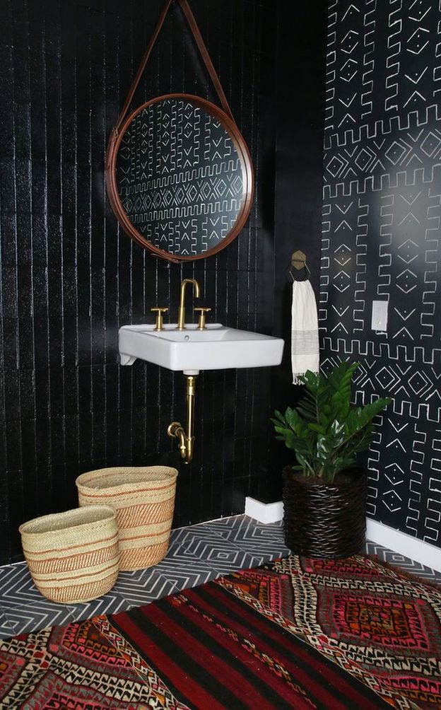 بضعی وقت ها برای کشتن حس بد و سنگینی که رنگ مشکی به فضا می آورد، یک کلک دیگر زده می شود و آن استفاده از وسایل و لوازمی است که با رنگ های تند و پر کنتراست خود این مردگی را از بین برده و فضا را به نوعی می شکنند. در این تصویر رویکرد فوق را به وضوح مشاهده می کنید. همانطوری که می بینید در اینجا رنگ مشکی به خدمت فضای فوق العاده ای درآمده است که سایر اجزای جذاب فضا ایجادکرده اند. در اینجا غم و سیاهی که رنگ مشکی القامی کند بوسیله بافت های کاغذدیواری و اشیاء با رنگ های فوق العاده در فضا از بین رفته است؛ سبد حصیری و قالیچه. همه اینها البته در کنار کاغذدیواری سیاه و سفید و روشویی سفید کامل شده است. -