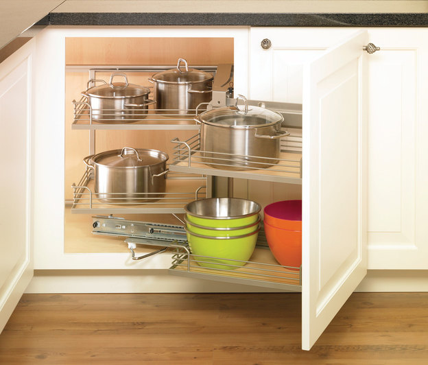 بسیاری از تولیدکنندگان کابینت، واحدهایی در دسترس قرار دادهاند که در کابینت گوشهی کور جا میگیرد. یکی از تولیدکنندگان اصلی Rev - A - Shelf است که این واحد را میسازد. این واحد ممکن است از چوب یا پلاستیک همراه دو نیم هلال یا نیمدایرهای تهیه شده باشد که در کنار میلهی کناری در حرکت اند. بیش تر قفسهها مستقل عمل میکنند و ممکن است نیم یا همهی آنها بیرون کشیده شود. برخی نیز به سمت کاربر با حرکت چرخشی بیرون میآیند. این یونیت ها خوب و کاربردی اند و در بیشتر موارد، گزینهی کمهزینهتری هستند.