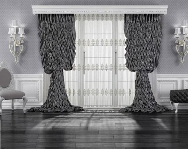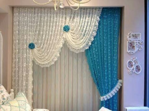 این ایده بسیار دلنشین است. در زیر، آستر ساده و بر روی آن تور با طرح گل در بالا قرار گرفته است. مدل این پرده نشان دهنده ی دانش مد پشت آن است و تماشای آن برای بیننده دلچسب خواهد بود.