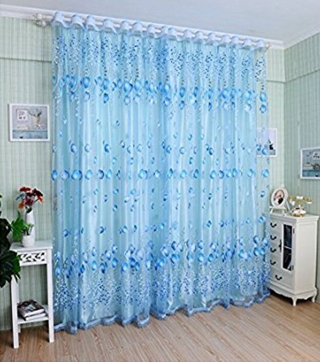 رنگ آبی این پرده بسیار دلنشین است. در زیر یک آستر ساده و بر روی آن پارچه ی حریر با طرح های بادکنک به رنگ آبی در اندازه های کوچک و بزرگ قرار دارد. این رنگ های آبی تیره و روشن بسیار اثرگذار و نشان دهنده ی سلیقه ای خاص هستند.