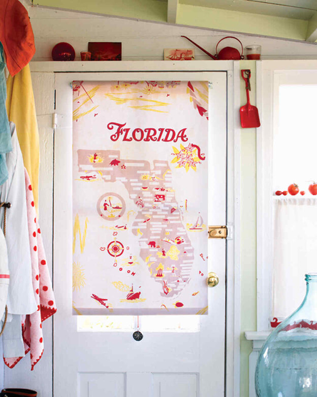 رومیزی هایی که طرح نقشه روی آنها چاپ شده است، چهاز جنس کتان ضخیم باشند چه لنین، می توانند برای هرگونه کاردستی مناسب باشند. ما یک طراحی فلوریدای به یک آفتابگیر رولی بخشیدیم، آن هم از طریق فیوزینگ پارچه به لنین و سپس منگنه کردن ان به افتابگیر سابق مغازه. برای دوختن جیب سربی (همان فضایی که سرب از ان عبور داده می شود)، لبه ی پایینی را ½ اینچ، سپس دوباره 2/11 اینچ تو بدهید و سپس از قسمت گوشه ها محکم کنید: در آخر هم اگر مایل بودید یک گیره ی زیبا به پشت آفتابگیر آویزان کنید.