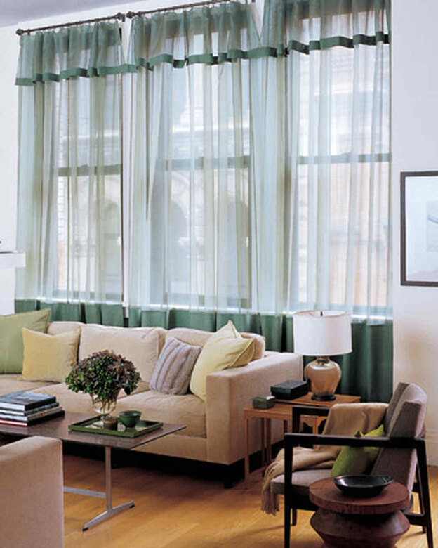 آراستگی و کمال را از طریق پین دادن به لایه های حریر ارگانزا و لنینی به رنگی کمی روشن تر از آن به وجود بیاورید. پنل های لنینی سبزرنگ بر روی لایه های حریر ارگانزا دقیقا همان رنگی را که باید به یک اتاق دکور شده با رنگ های خنثی می دهد. شما به قطعه پارچه های احتیاج خواهید داشت که به بلندای پنجره هایتان باشند. همینطور باید 14 اینچ بیشتر برای تو دادن لبه ها در نظر بگیرید: یک قسمت از جنس لنین در پایین پرده، قد آن را تا زمین می کشاند.