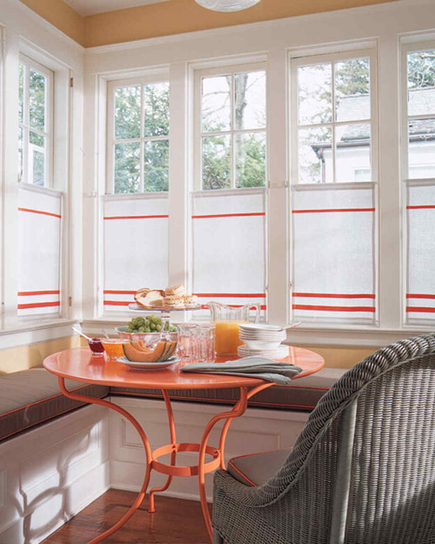آفتاب گیرهای جذاب کافه ای را با استفاده از پارچه ی لنین و نوار تویل نارنجی بیارایید. برای ساختن انها، یک راسته کوک ساده به لبه ی نوار تویل بزنید (نوار تویل باید 2/11 اینچ بلندتر از عرض خود پرده باشد). برای درست کردن فضای عبور دادن سرب، از همان کوک صاف برای سجاف دوزی لبه ها استفاده کرده و سپس 2 اینچ برای تو دادن و ایجاد آن فضا تو بدهید. نوار تویل را با دست بدوزید تا به پنل ظاهری حرفه ای و طراح مابانه بدهید (حدود 3 تا 5 کوک می تواند انتهای دوخت را محکم نگه دارد). قبل از آویزان کردن پرده ها، پردها را صاف کرده و سرب را از تو دادگی لبه ی پایین عبور دهید.برای نصب افتاب گیر از قلاب سوکتی استفاده کنید.