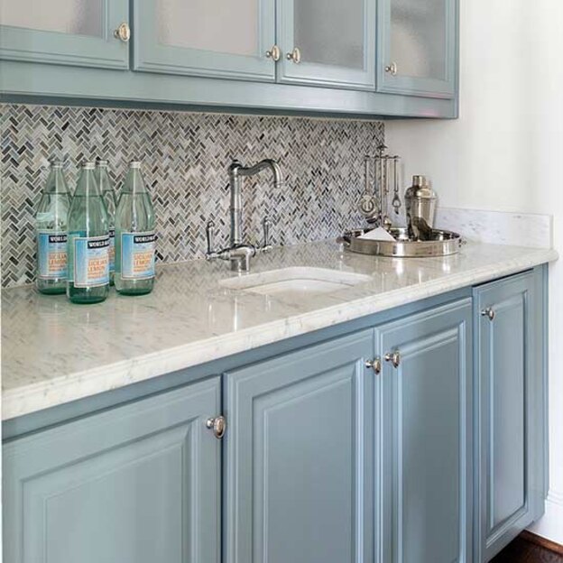 برای مثال، به جای انتخاب رنگ آبی روشن برای کابینت، می توانید از نوعی رنگ آبی با تن ترکیبی گرم و سرد استفاده کنید، مثل همین رنگ آبی روشن از بنجامین مور و خانه طراحی هدر اسکات.
