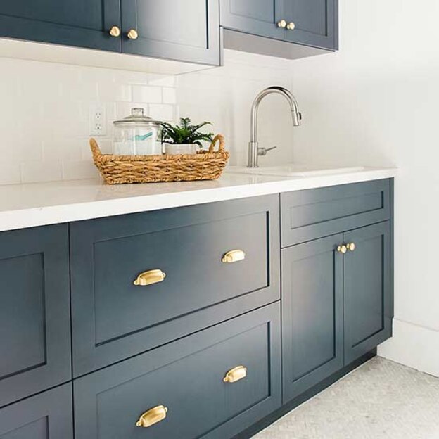 رنگ آبی نفتی بنجامین مور در کابینت های تصویر بالا نمونه کاملی از یک رنگ کلاسیک است. این رنگ با لایه های رنگ خاکستری و آبی پررنگ یکی از محبوب ترین رنگ های ترکیبی بازار است.