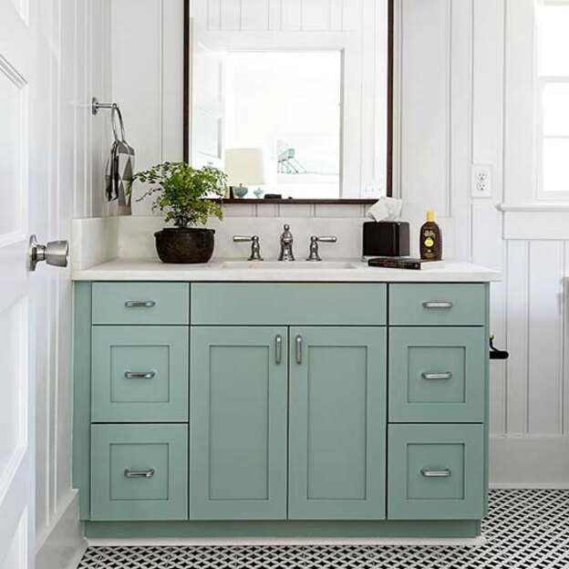 راه آسان دیگر برای متمایز نمودن رنگ کابینت این است که رنگ انتخابی شما با رنگ دیوار اتاق در تضاد باشد. این رنگ آبی سبز از بنجامین مور که با رنگ دیوار در تضاد است چشم ها را خیره کرده و دیدنی است. با انتخاب رنگ روشن فضا رنگ و رنگ پررنگ برای کابینت، کابینت های شما بیشتر به چشم می آید.