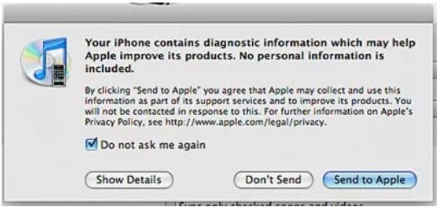 پس از اینکه بازیابی اولیه آیفون به پایان رسید، اما پیش از همگام سازی موسیقی در تلفن، آیتونز درباره ترجیح شما برای به اشتراک گذاری اطلاعات تشخیصی با اپل سوال می کند. این کار داوطلبانه است، با این حال به کیفیت خدمات اپل در آینده کمک می کند (اگر نگران فضای شخصی هستید این مرحله را کنار بگذارید، زیرا داده های نحوه استفاده از آیفون را به اشتراک می گذارد). گزینه مورد نظر را انتخاب کرده و ادامه دهید.