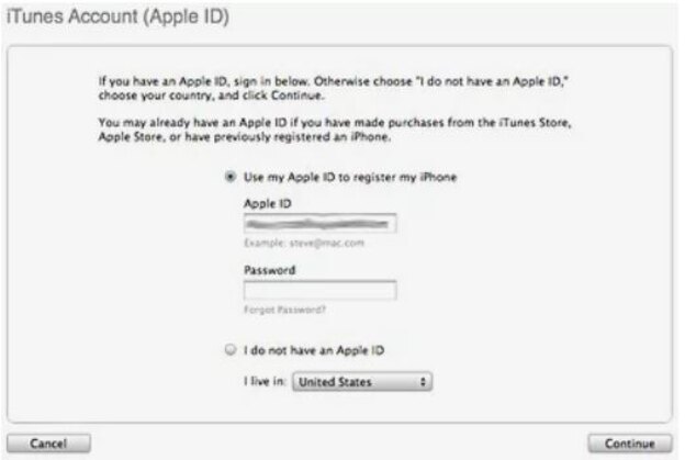اکنون باید اطلاعات اپل آیدی (Apple ID) خود را وارد کنید. این همان حسابی است که برای خرید از آیتونز استور یا فعال کردن آیفون، استفاده شده است. نیاز نیست حساب جدید ایجاد کنید. همچنین باید اطلاعات لازم را وارد کرده و گوشی را رجیستر کنید. سپس آیتونز مجوز استفاده رایگان از خدمات اپل می را ارائه می دهد. می توانید از آن استفاده کرده یا به مرحله بعد بروید.