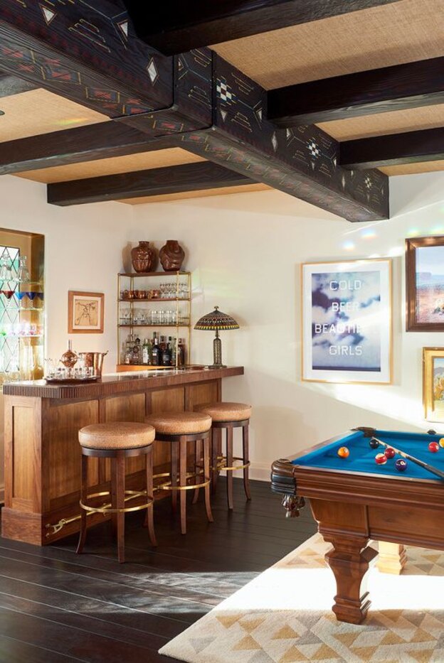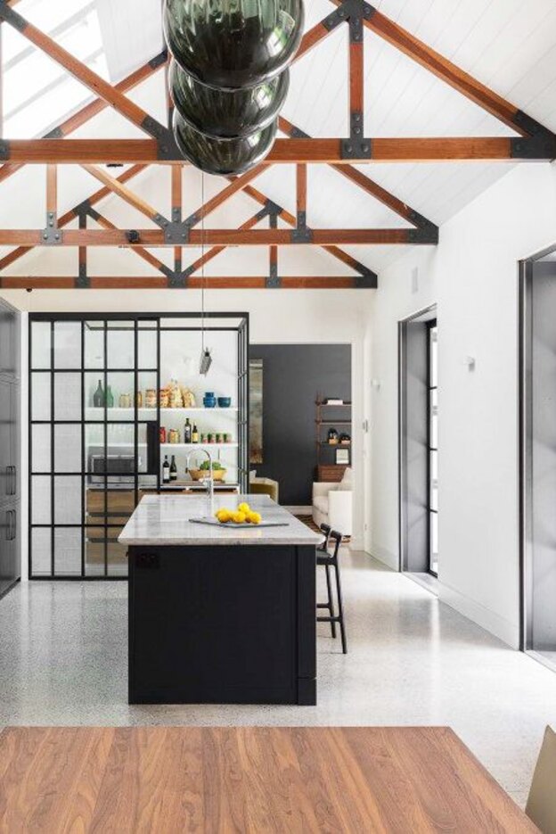 سقف کلیسا به مدل کلیساهای غربی ساخته شده و الوارهای چوب به حالت مثلث روی هم قرار می گیرند. این الوارها در حفره سقف که به حالت گنبد یا شیروانی قرار دارد نصب می شود. این طرح بسیار جذاب است و الوار تا قسمتی از دیوار ادامه پیدا می کند. در این تصویر این مدل سقف در آشپزخانه استفاده شده و طرح جذابی را به وجود آورده است.