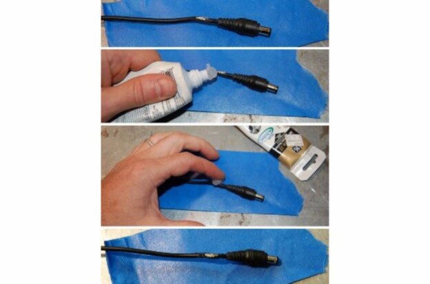 تعمیر سریع و کثیف سیم شارژر این است که نوار چسب را دور سیم الکتریکی یا مجرای آن بپیچید تا بیشتر آسیب نبیند.این از آسیب بیشتر جلوگیری می کند ، اما با گذشت زمان شل می شود - لازم به ذکر نیست که وقتی این کار را انجام میدهید ، تمام کابل چسبنده خواهد شد. یک راه بهتر، تعمیر دائمی تر با درزگیر سیلیکون که در هر فروشگاه سخت افزاری و بسیاری از سوپر مارکت ها موجود است می باشد که باعث عایق بندی و محافظت از آن می شود. بهتر است از رنگ مشکی برای مطابقت با رنگ سیم رابط استفاده کنید ، اما درزگیر شفاف رنگ هم به خوبی کار می کند.برای محافظت از سطحی که روی آن کار میکنید ، ورقه ی گسترده ای از نوار چسب نقاشی - طرف چسبنده رو به پایین - پهن کنید و قسمت ساییده شده ی سیم را بر روی آن قرار دهید.درزگیر به نوار نقاشی نمی چسبد ( به همان طریقی که ممکن است به سایر سطوح ساخته شده از کاغذ یا پلاستیک بچسبد) ، و نوار چسب نقاشی بعد از انجام کار باید کاملا از روی میز جدا شود.