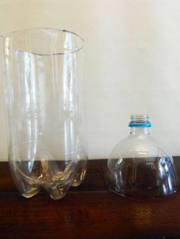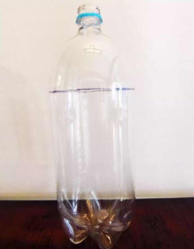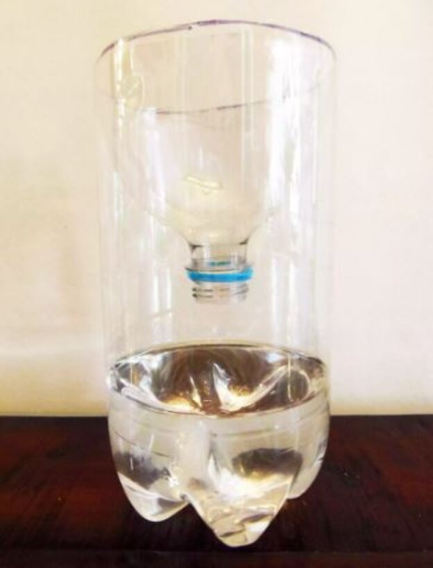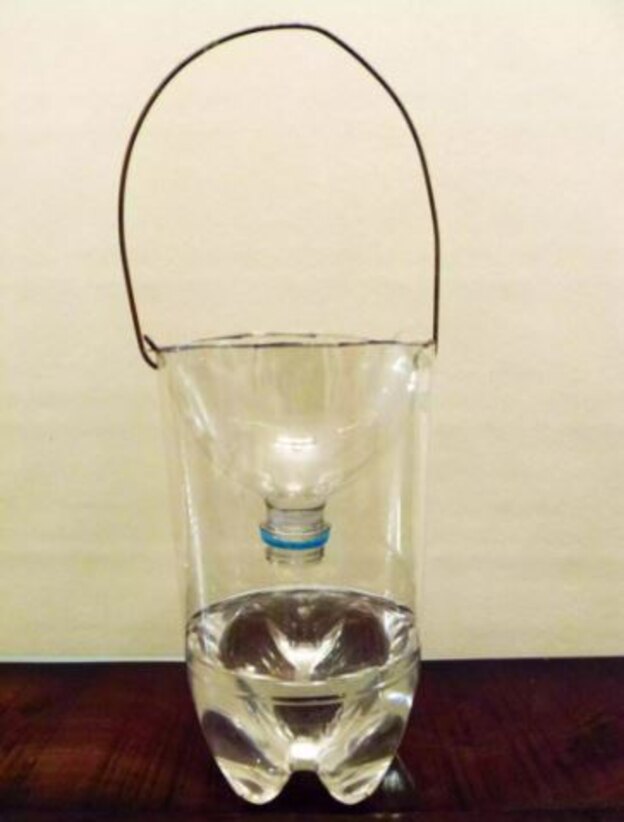 کلاهک را بردارید. سپس قسمت بالا را برعکس درون بطری بگذارید تا مانند یک قیف به نظر برسد و آن را به درون بطری هل دهید تا تله تان کامل شود.