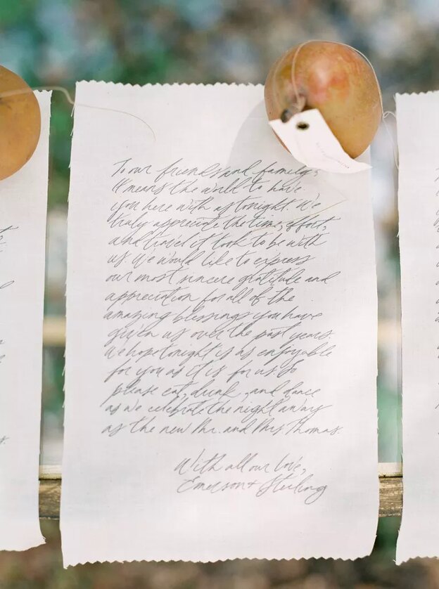 این روزها زوج ها با دست خودشان به مهمان ها یادداشت هایی دست نوشته (یا خوشنویسی شده) می دهند. سپس این یادداشت ها را روی میزی که هر مهمان می نشیند یا روی قسمت مخصوصی که برای کارت ها درنظر می گیرند می گذارند.توجه داشته باشید که این یادداشت مخصوص جای کارت تشکر که در آخر مهمانی به مهمانان می دهید را نمی گیرد اما فرصت بسیار خوبی برای این است که کاری کنید مهمانانتان احساس خاص بودن کنند. فقط یک نگاه به این یادداشت دلفریب بیاندازید!