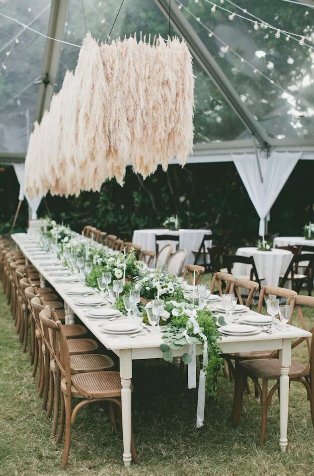 این گل ها که با یک نسیم به رقص در می آیند برای سر و ته آویزان شدن به صورت دسته های بزرگ و ایجاد یک دکور خیره کننده بالای میزها (مثل تصویر) بی نظیرند. ما گل پامپاس را در دسته گل عروس یا ساخت جایگاه عروس و داماد هم دیده ایم. اگر مراسمتان را به سبک بوهمیایی برگزار می کنید، گیاه پامپاس مال شماست.