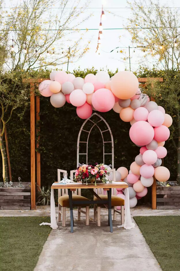 استفاده از بادکنک یکی از باحال ترین روش های رویایی و رنگارنگ کردن مراسم عروسی است. در سالهای گذشته دیدم که بادکنک ها را از گوشه میز و صندلی ها آویزان کنند یا برای عکاسی زوج ها استفاده شود، اما الان شاهد این هستیم که جلب توجه می کنند و گوشه ای از شخصیت مهمانی را شکل می دهند. بد نیست با گل آرا یا طراح دکوراسیون مهمانی راجع به درست کردن طاقی بادکنکی مثل این مدل صورتی صحبت کنید، یا یک دیوار متحرک با چنین تزئیناتی به عنوان محل عکس برداری یا چیدن میز خاطره تهیه کنید.