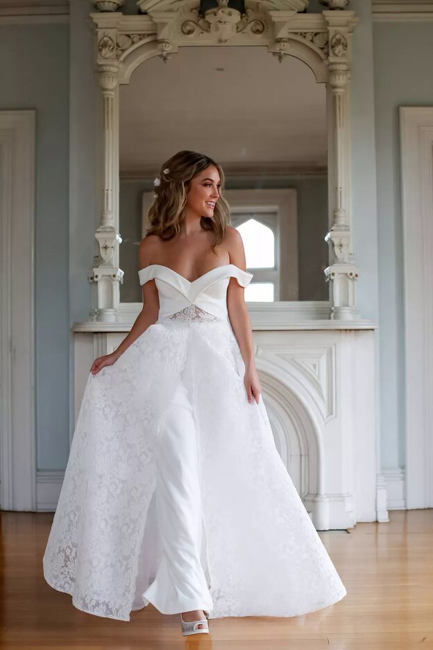 چه لباس عروس کیت میدلتن که آستین توری داشت، په لباس عروس مگن مارکل با آستین قاشقی اش، نشان می دهند که آستین لباس عروس هر از چندگاه جای خودش را دوباره پیدا می کند. آستین های افتاده روی شانه مثل تصویر اجازه می دهند شما هم با مد آستین لباس عروس همراه شوید و حال و هوای کلاسیک و همیشه جذاب بودن را به لباستان بدهید. به علاوه، این لباس دو مد دیگر را هم رعایت کرده؛ تزئینات گل دار و قابلیت تغییر به یک مدل دیگر. بعد از مراسم عقد می توانید لایه رویی دامن را بردارید تا برای بزن و برقص مهمانی لباسی سبک تر و متفاوت داشته باشید.