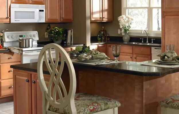 این جزیره آشپزخانه ال مانند برای دو نفر جای نشستن دارد. این کابینت ها چوبی و به رنگ دارچینی هستند. اگر مادرتان عادت دارد در همه کارهای شما نظر بدهد، می توانید یک جایگاه ناظر برای او درست کنید.
