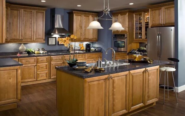 در این طرح جزیره فرانسوی سنتی را میبینید. به ستون های دو طرف جزیره نگاه کنید که حالت شیک و لوکس ایجاد می کنند. کابینت چوبی افرا با رنگ شیری.