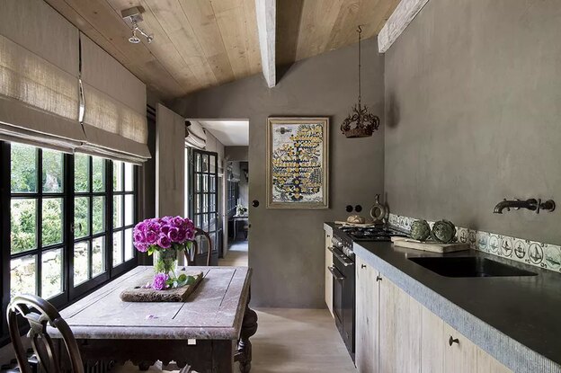 در کنار پتینه می توانید از عناصر جدید و مدرن استفاده کنید و جذابیت دکوراسیون بلژیکی هم همین پویایی آن است. عناصر قدیمی با جدید ادغام شده و ظاهری چند لایه ایجاد می کند. مخصوصا عناصر صنعتی مانند چراغ های آویز این تصویر که در کنار دیوار سنگی ظاهر خاصی ایجاد کرده است.