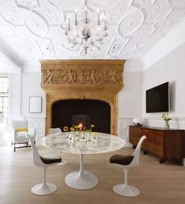 این اتاق با کمک ابزارهای گچی سفید حجم فضا را افزایش می دهد. با اینکه برای این کار راه های مختلف وجود دارد، از استفاده از کاغذ دیواری تا رنگ های رنگارنگ، که می توانند از نظر کلاسیک، تاریخی و افزودن جزئیات جالب باشند، اما این سقف در کنار شومینه قهوه ای دیدنی شده است. بنابراین می بینید که رنگ سفید به بهترین شکل ممکن استفاده شده است.