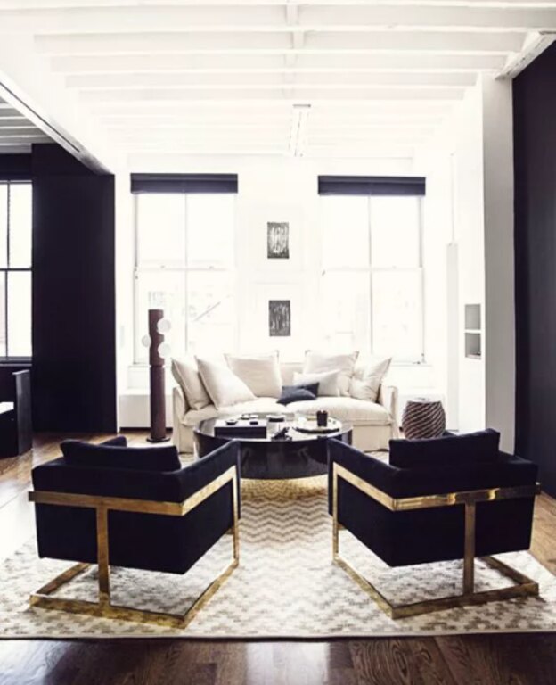 دیوارها همیشه نباید سفید باشند و البته تمام قسمت های آن نباید سفید باشند. زمانی که می خواهید رنگ ها را ترکیب کنید بهترین راه ترکیب نمودن رنگ های قالیچه و لوازم است. در این نشیمن، رنگ دیوار به دو رنگ سفید و مشکی تقسیم می شود. بر روی کف، مبل سفید و صندلی های مشکی عمق فضا را افزایش می دهند. با این حال این مبل های سفید هستند که در میان دیوارهای سیاه و میز و صندلی خود را به رخ می کشند.