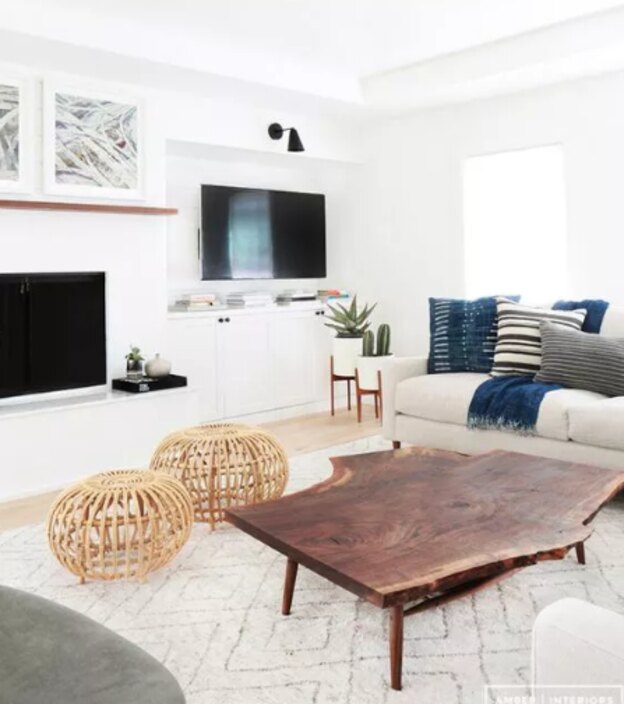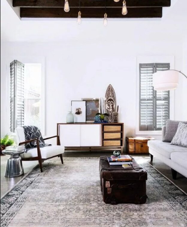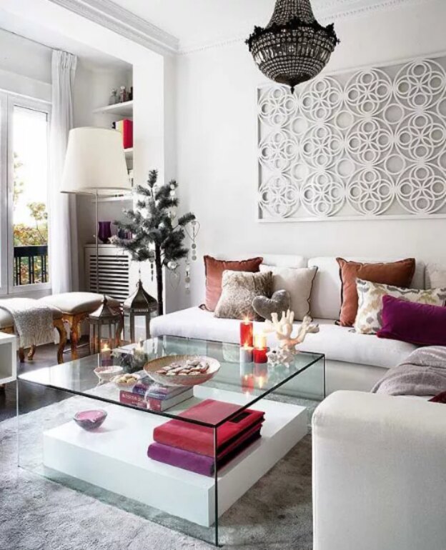 از آنجایی که دکوراسیون سفید به ترکیب رنگ های گرم و سرد کمک می کند می تواند یک فضای آرامش بخش را خلق نماید. رنگ سفید روی دیوار این اتاق با رنگ سفید و مشکی قالیچه مراکشی کف ترکیب می شود. رنگ چوب میز و توپک های چوبی با این فضا ترکیب شده اند.
