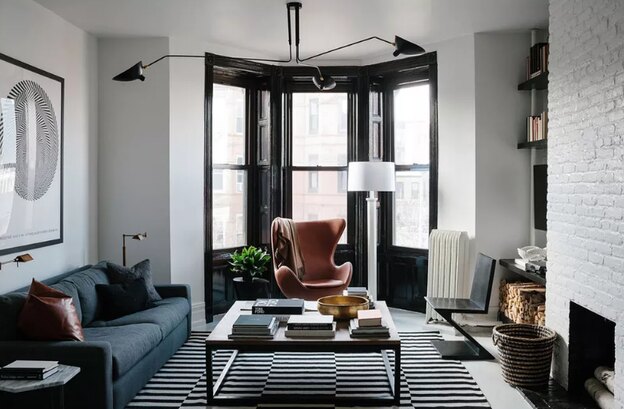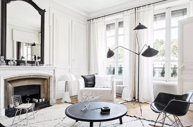 در دنیای طراحی رنگ های ترکیبی بسیاری وجود دارد اما مسلما هیچ کدام به اندازه ترکیب رنگ های سیاه و سفید قدرتمند نیستند. به این صورت که طیف های رنگ سفید با رنگ سیاه و تیره کف و شومینه ادغام می شود. این اتاق تک رنگ بوه و اغلب لوازم تنها در یک رنگ موجود بوده و طرح ندارند. به همین دلیل فرش زیبا توانسته مکمل خوبی باشد و بالش های سیاه و سفید هم فض را گرد هم می آورد. این طراحی مینیمال مدرن، شیک و آرامش بخش است.