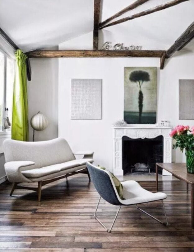 سفید ملکه رنگ هاست و زمانی که به عنوان رنگ اصلی استفاده می شود باید رنگ های دیگری را با آن ادغام کنیم تا جلوه فضا افزایش پیدا کند. در این حین نمی توان از ترکیب رنگ های مختلف استفاده کرد، به همین دلیل است که اغلب رنگ قهوه ای چوب انتخاب می شود. زیرا رنگ چوب گرمای فضا را افزایش می دهد و ترکیب قهوه ای و رنگ طبیعی چوب بسیار دیدنی است. الوارهای چوبی با جلوه روستایی و صنعتی در سقف و همچنین در کف جلوه زیبایی را خلق کرده اند.