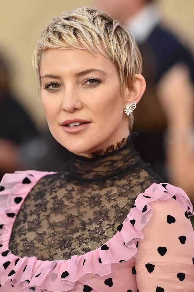 موی به جلو شانه شده ی هادسن هم کلاسیک است و هم شیک. نگران رشد تیره رنگ ریشه ی مو نباشید. می توانید با فرق کج و موی فر این تضاد را به زیبایی محو کنید.