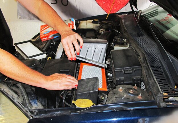 وقتی جعبه هوا را باز کردید، می توانید برش دارید تا فیلتر هوا را ببینید که احتمالا بخاطر آلودگی هایی که تهویه کرده، سیاه شده است. فیلتر قدیمی را بیرون بکشید و با یک فیلتر نو تمیز سفید جایگزینش کنید.