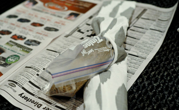 کیسه های شن را یکی یکی از شکاف وسط پارچه داخل کنید. اگر رد نمی شد کمی از شن و ماسه آن را خالی کنید.