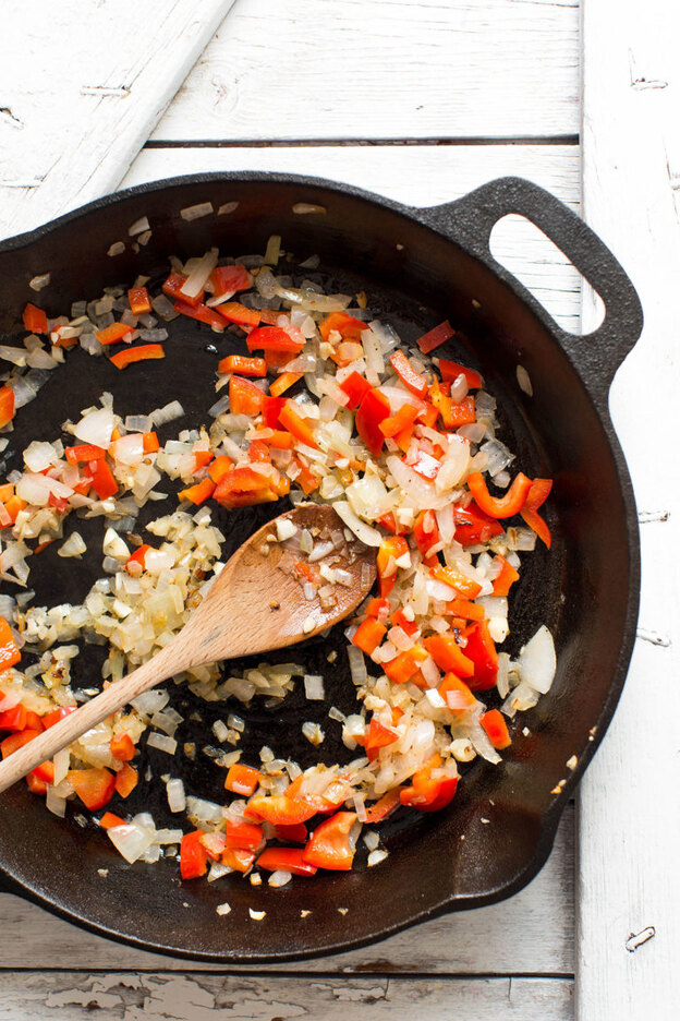 - یک ظرف بزرگ فلزی یا تابه را روی حرارت متوسط بگذارید. پس از داغ شدن، روغن زیتون، پیاز، فلفل دلمه و سیر را به آن اضافه کنید. حدود 4 تا 5 دقیقه مواد را هم بزنید تا پیاز نرم و طلایی شود.