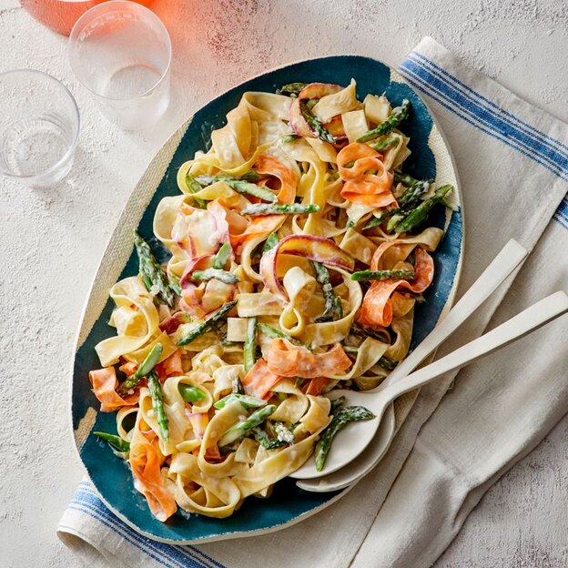 خامه را به تابه اضافه کرده و تفت دهید. هویج و پوست لیمو را اضافه کرده و 3 دقیقه تفت دهید. پاستا را هم توی تابه بریزید. مارچوبه، نخودفرنگی، ترخون و یک چهارم قاشق چایخوری نمک و مقداری از مایع پاستا را اضافه کنید.