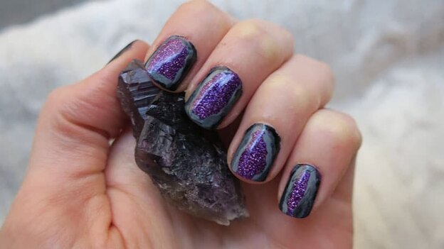 ناخن هایی با درخشش سنگ ها در سال 2017 محبوب بودند. می توانید هنوز هم از رنگ های مشکی و بنفش درخشان استفاده کنید. با این سبک به ناخن های شیک دست می یابید.
