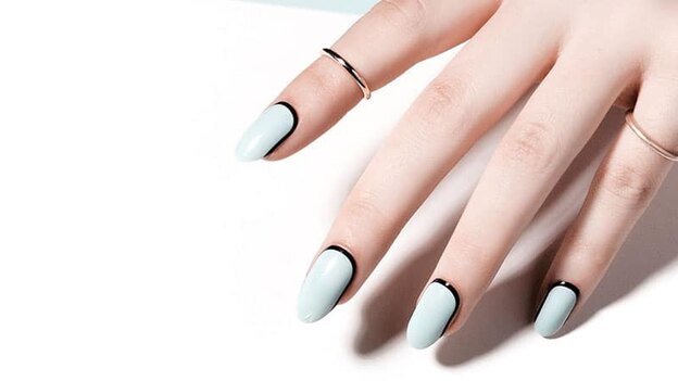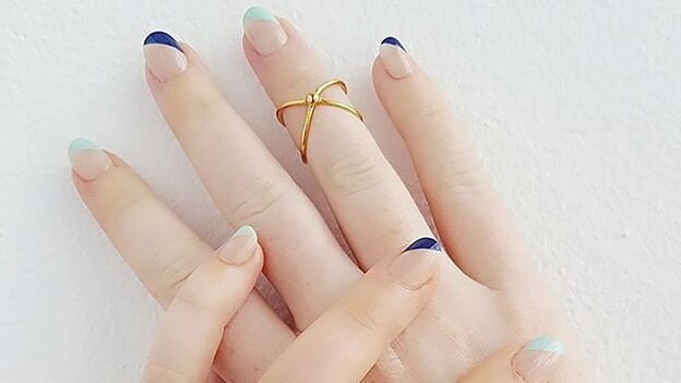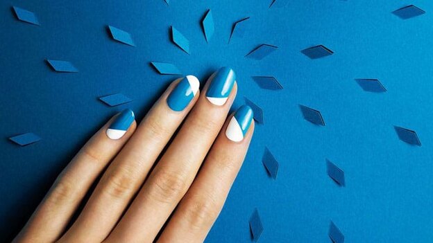 می توانید مانیکور فرانسوی تکراری تان را به یک طرح خلاقانه تبدیل کنید. به جای رنگ سفید روی ناخن، از رنگ های آبی، متقارن یا منحنی استفاده کنید.