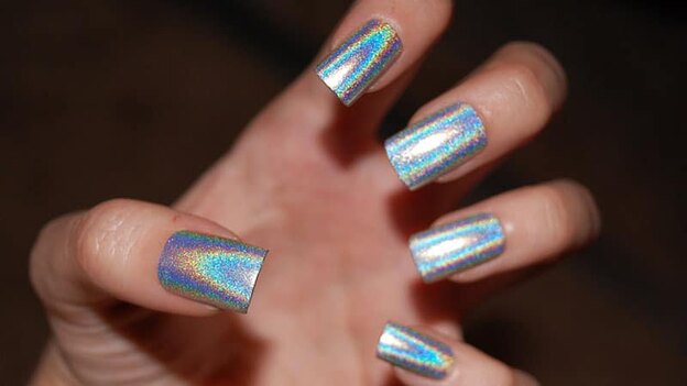 پس از ناخن های متالیک امسال ناخن های درخشان هولوگرافیک مد هستند. این طرح جالب و آینده ای رنگ های مختلف را به نمایش گذاشته و چشمگیر است. می توانید روی ناخن برق ناخن زده، و پودر هولوگرافیک استفاده کنید.