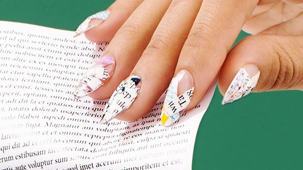 ناخن های روزنامه ای خلاقانه و جالب هستند. در این طرح می توانید از تمبر یا روزنامه واقعی بر روی ناخن استفاده کنید. مراقب باشید مردم ناخن های شما را نخوانند.