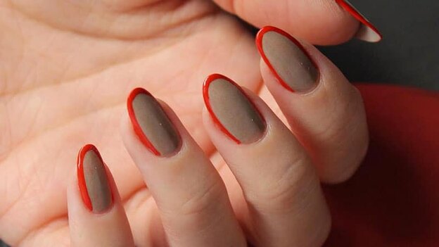 یکی طرح ساده که در خانه هم به دست می آید این طرح با لبه های بیرونی متمایز است. ابتدا باید رنگ زمینه را برای ناخن استفاده کنید. سپس بعد از خشک شدن آن یک رنگ برجسته مانند قرمز را برای لبه ها انتخاب نمایید.