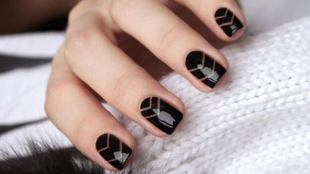 ناخن های هندسی مد روز و شیک هستند. برای رسیدن به این طرح به رنگ های خنثی مانند سفید، بی رنگ و مشکی و البته کمی لاک قرمز نیاز دارید.