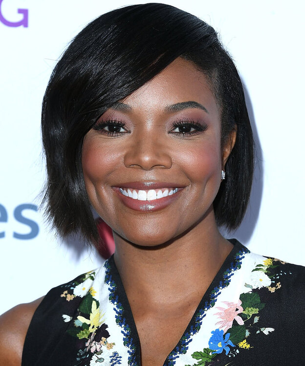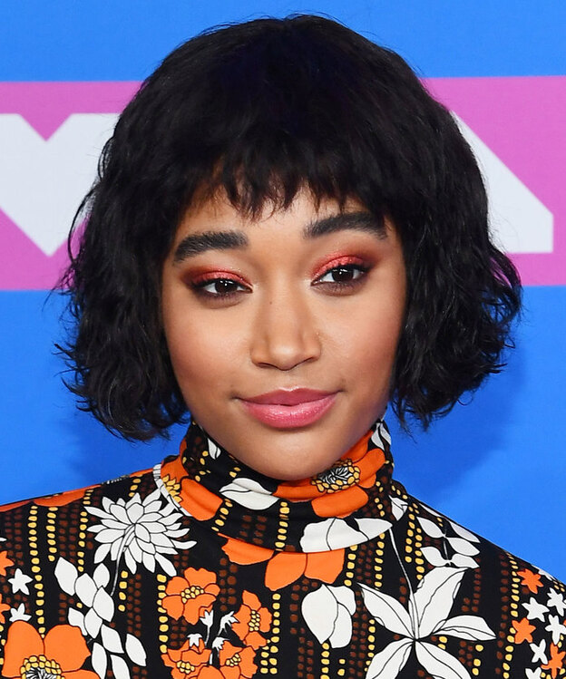 موهای اما رابرتز تا چانه بوده و قسمتی از آن را توسط یک گیره مو کنار زده است.