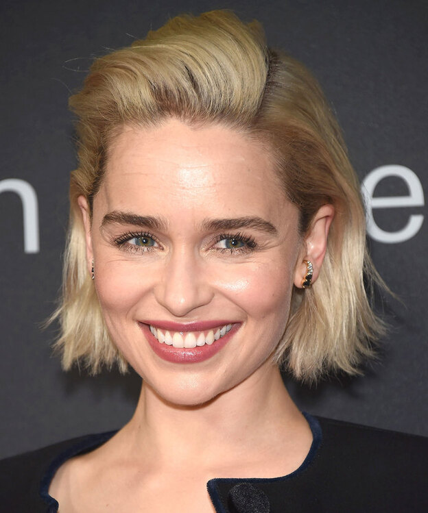 امیلیا کلارک با ایجاد یک تغییر در فرق مج استاندارد، قسمت بیرونی تر کوپ بلندش را عقب فرستاده و در قسمت بالا سر حجم ایجاد کرده است.