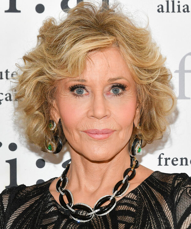 جین فاندا با ایجاد پله و موج های بزرگ و باز شده به موهای کوپ بلندش حجم و حالت می دهد.