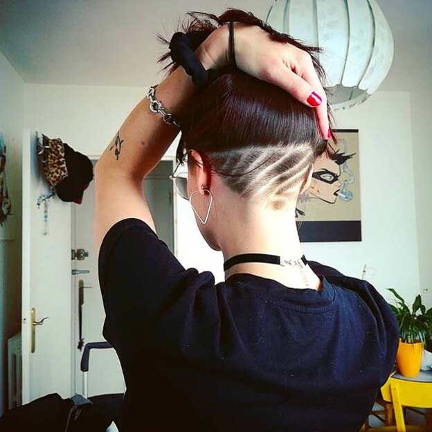 آیا یک تراشیدگی باحال با طرحی هیجان انگیز می خواهید؟ پس به این مدل نگاه کنید. خب، کوپ کوتاه و شلاقی و مشکی، و تراشیدگی خیلی کوتاه با یک طرح. از آنجایی که مو در قسمت پشت خیلی کوتاه است، تراشیدگی خودش را بیشتر نشان می دهد. این مدل با موی مشکی عالی می شود اما با رنگ های جیغ دیگر هم خیلی خوب از آب در می آید.