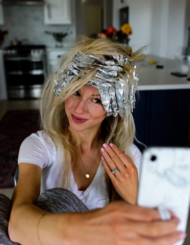 اجازه دهید تا رنگ بگیرد. روی بسته دکلره اطلاعات لازم وجود دارد. با کمک حرارت می توانید فرایند را تسریع کنید، اما با این کار موهایتان سریع تر آسیب میبیند، پس کمی صبر کنید. دکلره کرم مانند سریع تر عمل می کند. به تدریج با نگاه کردن به مو متوجه می شوید چه زمانی موهایتان دکلره شده، که البته این کار با آزمون و خطا آموخته می شود. از آنجایی که من می خواهم بلوند یخی داشته باشم، باید منتظر شوم تا موهایم کاملا سفید شود. اگر مو زرد شده، صبر کنید. باید قسمت های مختلف را بررسی کنید، هر قسمتی که آماده شده از لای فویل بیرون بیاورید. معمولا 45 دقیقه طول می کشد تا کل مو آماده شود. گاهی اوقات نیز پس از 5 تا 10 دقیقه از گذاشتن آخرین فویل، رنگ آماده است.