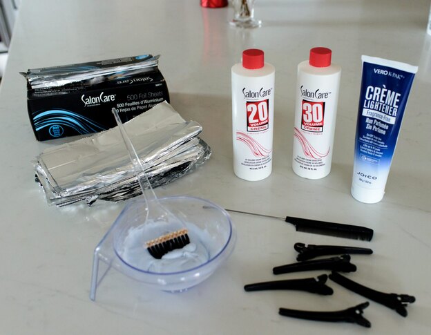 دکلره را آماده کنید. دکلره و اکسیدان را در کاسه مخلوط کنید. دستورالعمل بسته دکلره را دنبال کنید. 60 میلی لیتر از هر کدام کافی است.