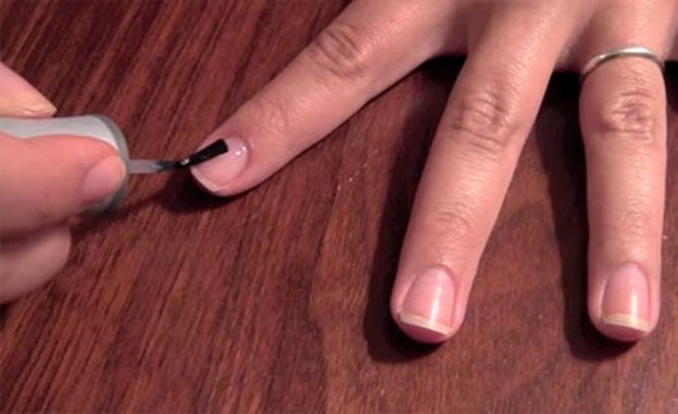 با دقت به نوک ناخن لاک بزنید. نوار لاستیکی این کار را آسان کرده و هیچ بی نظمی برجا نمی گذارد.