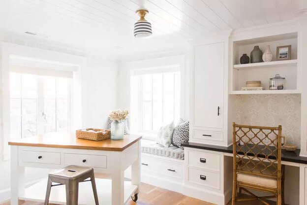 به گفته شرکت استودیومکجی "نورپردازی سقفی می تواند به اندازه نورپردازی آویز دار خاص باشد." و این فضای آشپزخانه که آنها طراحی کرده اند منظور آنها را تمام و کمال می رساند. این قطعه مدرسه ای با راه راه های آبی پررنگ به این آشپزخانه سفید الهام گرفته از خانه های کشاورزان احساسی فریبنده می بخشد.