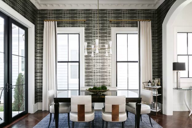یکی دیگر از اشکال شناخته شده مدرن بری نورپردازی، ساعت شنی است. نقطه قوت این اتاق ناهارخوری شیک که توسط لزلی کاتر طراحی شده است، یک لوستر ساعت شنی نسبتا قدیمی است با روکش پودری سفید. این لوستر به همراه کاغذ دیواری به این فضای غذاخوری حسی چندگانه بخشیده است.